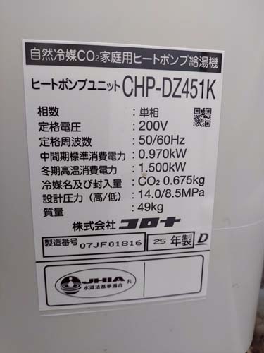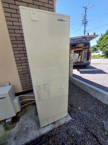 新宮市緑ヶ丘 コロナ自然冷媒CO2家庭用ヒートポンプ給湯機 ヒートポンプユニットCHP-DZ451K エコキュート交換工事