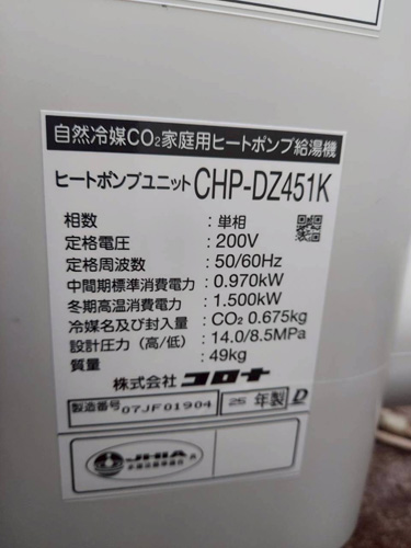 橋本市高野口町 コロナ自然冷媒CO2家庭用ヒートポンプ給湯機ヒートポンプユニットCHP-DZ451K、貯湯ユニットCTU-37AZ1K エコキュート交換工事