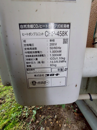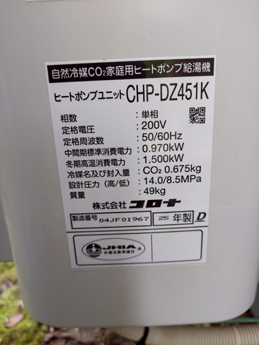 海南市 コロナ自然冷媒CO2家庭用ヒートポンプ給湯機 ヒートポンプユニットCHP-DZ451K エコキュート交換工事